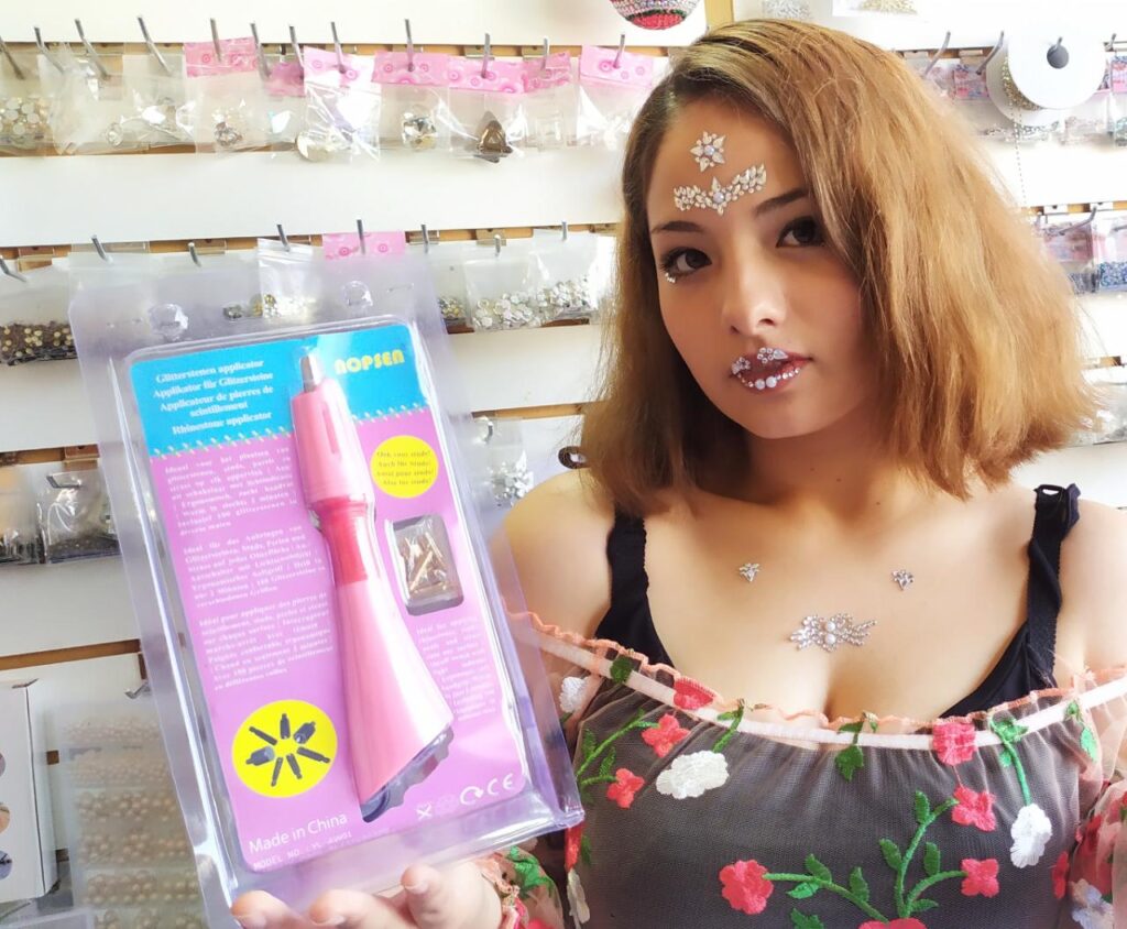 - Aplicador strass, es el método mas sencillo de todos. se trata de una especie de soldador que emite calor para poner piedras strass, cuenta con 7 puntas, troqueles o picos que calentaran en aproximadamente unos 5 minutos al presionar el botón de encendido del aplicador . Estos picos, troqueles o puntas tienen las tallas a un costado ss6 o 2mm -ss10 o 3mm – ss16 o 4mm – ss20 o 5mm – ss30 o 6.5mm -ss40 o 8mm y uno plano para aplicar piedras, latas o coopers de mayor tamaño o de diferentes formas. Una vez que caliente el aplicador debes presionar la piedra por la parte superior, el calor viaja hasta la base de esta piedra, justo hasta donde está recubierta con un material termoadhesivo, esto quiere decir que el calor hace que se derrita funcionando como pegamento para fijar la piedra u otro Hotfix donde desees.
